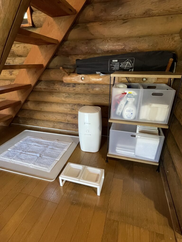 岩井ロッジではペットとの宿泊が可能です。犬用の食器やトイレシート、コットなど必要なものは一通り用意してあります。