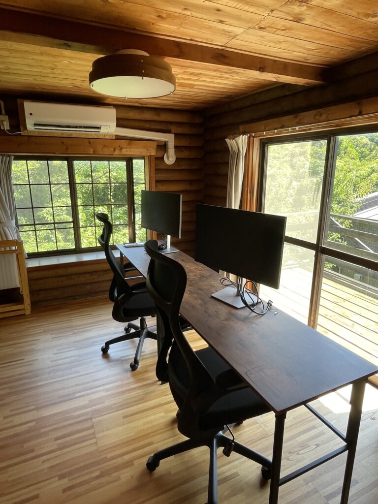 また、岩井ロッジには光回線でのインターネット接続、ワークデスクと液晶モニターを用意しており、テレワークの環境が整っています。午前中は遠くに海を眺めながら仕事をし、午後はアクティビティを楽しむといった、ワーケーション体験にも最適です。